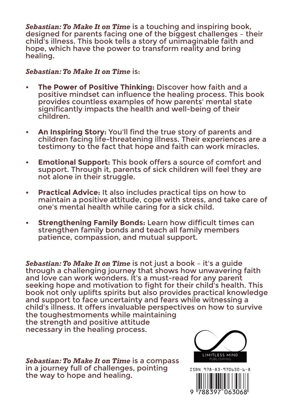 Sebastian: To Make It on Time is not just a book - it's a guide through a challenging journey that shows how unwavering faith and love can work wonders. It's a must-read for any parent seeking hope and motivation to fight for their child's health. This book not only uplifts spirits but also provides practical knowledge and support to face uncertainty and fears while witnessing a child's illness.