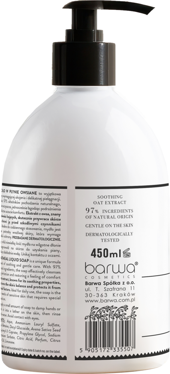 Rich, liquid oat soap is a hypoallergenic product, created for dry, sensitive and allergy-prone skin. Thanks to its natural formula, oat soap effectively cleanses the skin, while moisturizing it and soothing irritation.