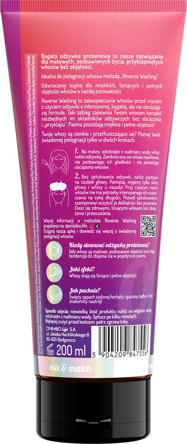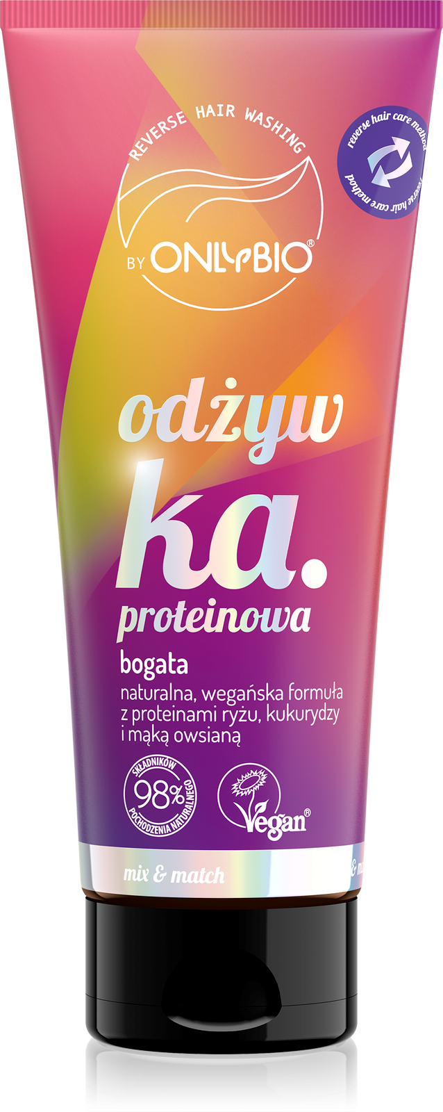 - Vegan protein conditioner from the Reverse hair washing series from Onlybio contains as much as 98% ingredients of natural origin, caring for the appearance and condition of the strands.