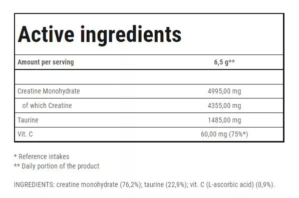 Original creatine in the form of monohydrate enriched with added taurine and vitamin C, whose effect on the condition of the musculoskeletal system and support of immunity is extremely important from the point of view of every physically active person.