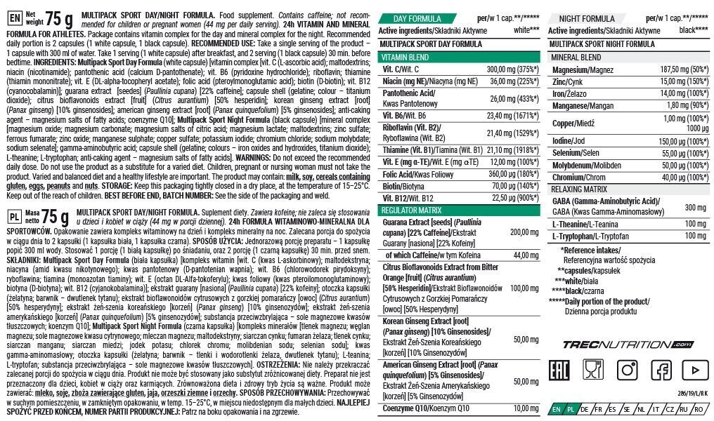 Multipack SportDay Formula (day capsule) [vitamin complex [vitamin C (L-ascorbic acid); maltodextrin; niacin (nicotinamide); pantothenic acid (calcium D-pantothenate); riboflavin; thiamine (thiamine mononitrate); vitamin E (DL-Alpha-tocopheryl acetate); vitamin B6 (pyridoxine hydrochloride); folic acid (pteroylmonoglutamic acid); biotin (D-biotin); vitamin B12 (cyanocobalamin)]; guarana extract [seeds] (Paullinia cupana) [22% caffeine]; capsule shell (gelatin)B / (glazing agent - hydroxypropyl methylcellulose)C / (gelatin; colour - titanium dioxide)D; citrus bioflavonoid extract from bitter orange [fruit] (Citrus aurantium) [50% hesperidin]; Korean ginseng extract [root] (Panax ginseng) [10% ginsenosides]; American ginseng extract [root] (Panax quinquefolius) [5% ginsenosides]; anti-caking agent – magnesium salts of fatty acids; coenzyme Q10 (ubiquinone)]. B, C, DSee symbol after production batch number.