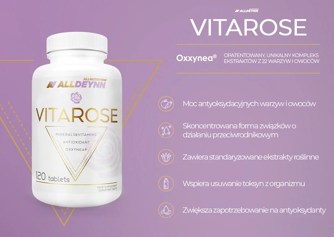 Jest odpowiedni dla Was, Waszych mam, babć i córek. Wszystkie znajdą tu coś dla siebie. Wsparcie antyoksydacyjne, dzięki dodatkowi Oxxynea®, który spowalnia proces starzenia się. Witaminom i minerałom wpływającym na ogólne funkcjonowanie Waszego organizmu oraz naturalnym ekstraktem z gorzkiej pomarańczy wspomagający metabolizm oraz spalanie tkanki tłuszczowej. VitaRose to także beta-karoten oraz mieszanka warzyw i owoców, które skutecznie uzupełnią Twoją codzienną dietę w mikro i makro elementy.