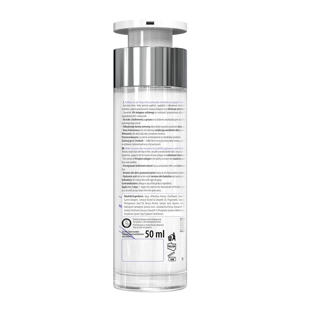 Aksamitny krem, który pomoże ujędrnić, wygładzić i odbudować strukturę skóry. Skutecznie przyspiesza regenerację naskórka, wspiera powstawanie nowego kolagenu oraz eliminuje utrwalone na skórze oznaki starzenia. Produkt zawiera 4% kolagen roślinny, który przywraca skórze elastyczność oraz jędrność, a także daje efekt wygładzenia linii i zmarszczek. Zwiększa nawilżenie skóry oraz przyspiesza jej regenerację. Odbudowuje barierę ochronną skóry dzięki wysokiej zawartości oleju z nasion żmijowca.