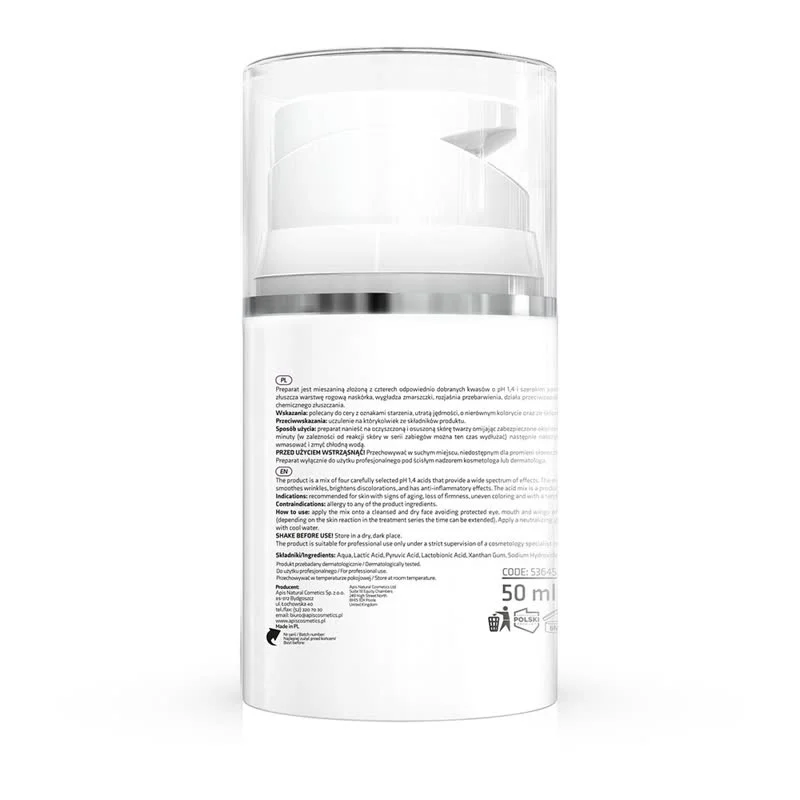 Preparat jest mieszaniną czterech odpowiednio dobranych kwasów o pH 1,4 i szerokim spektrum działania. Intensywne działanie kwasu złuszcza warstwę rogową naskórka, wygładza zmarszczki, rozjaśnia przebarwienia, działa przeciwzapalnie.
