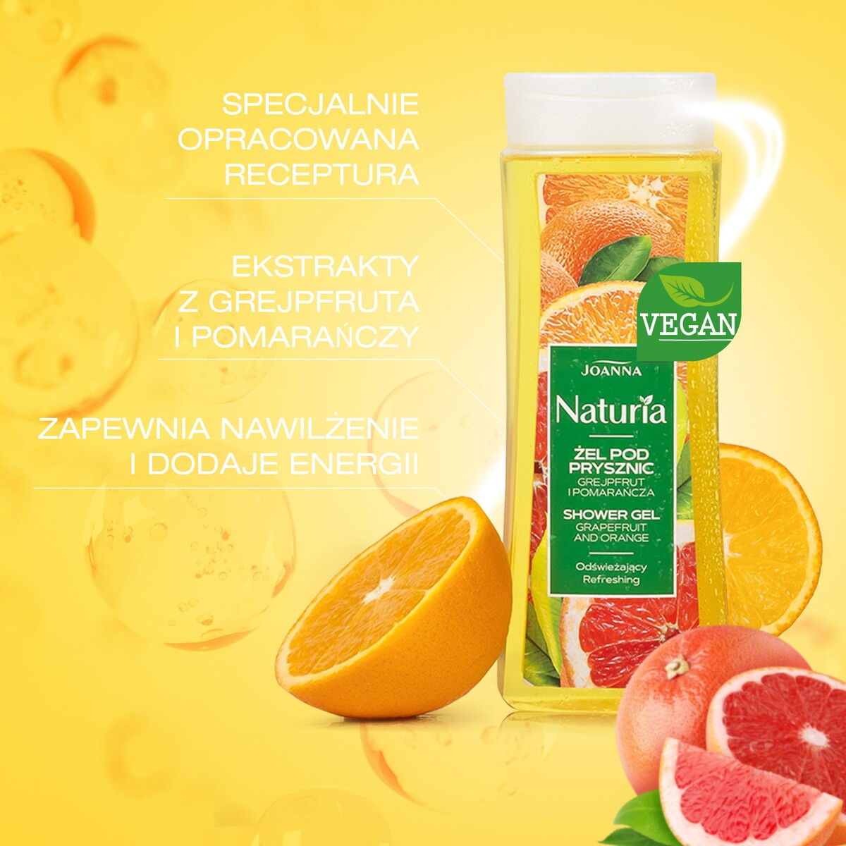 - Orzeźwiająca pielęgnacja dla Twojego ciała. Żel pod prysznic Naturia o świeżym owocowym zapachu zapewnia doskonałe odprężenie i oczyszczenie ciała. Specjalnie opracowana receptura zawiera ekstrakty z grejpfruta i pomarańczy.