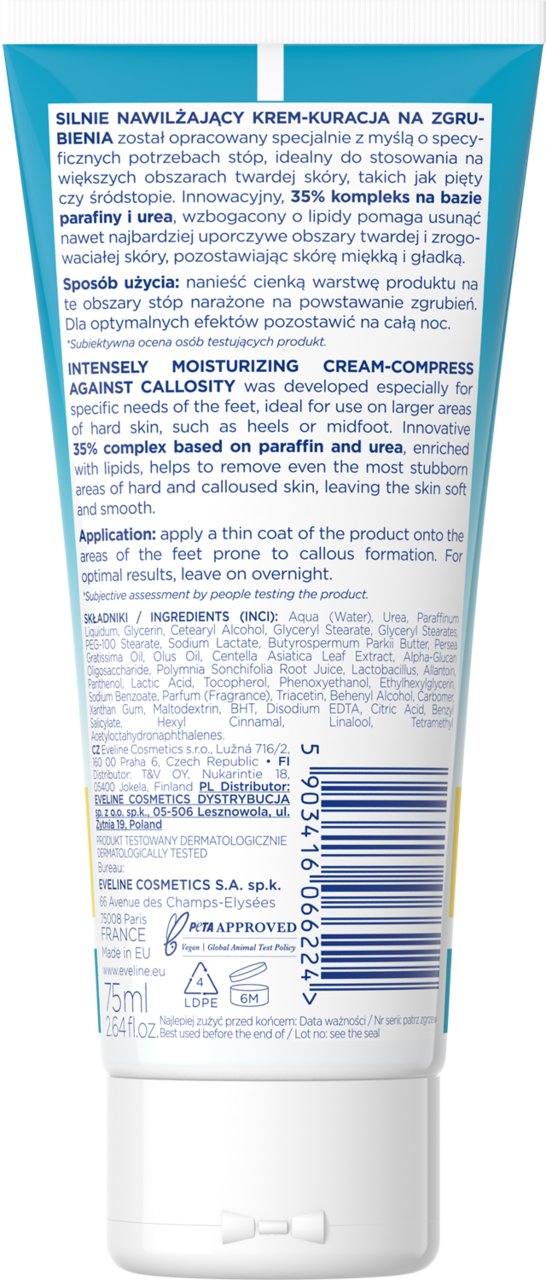 - Wegańska formuła skutecznie zwalcza zrogowacenia stóp, dzięki obecności 35% kompleksu z mocznikiem i parafiną działa już po jednej nocy.