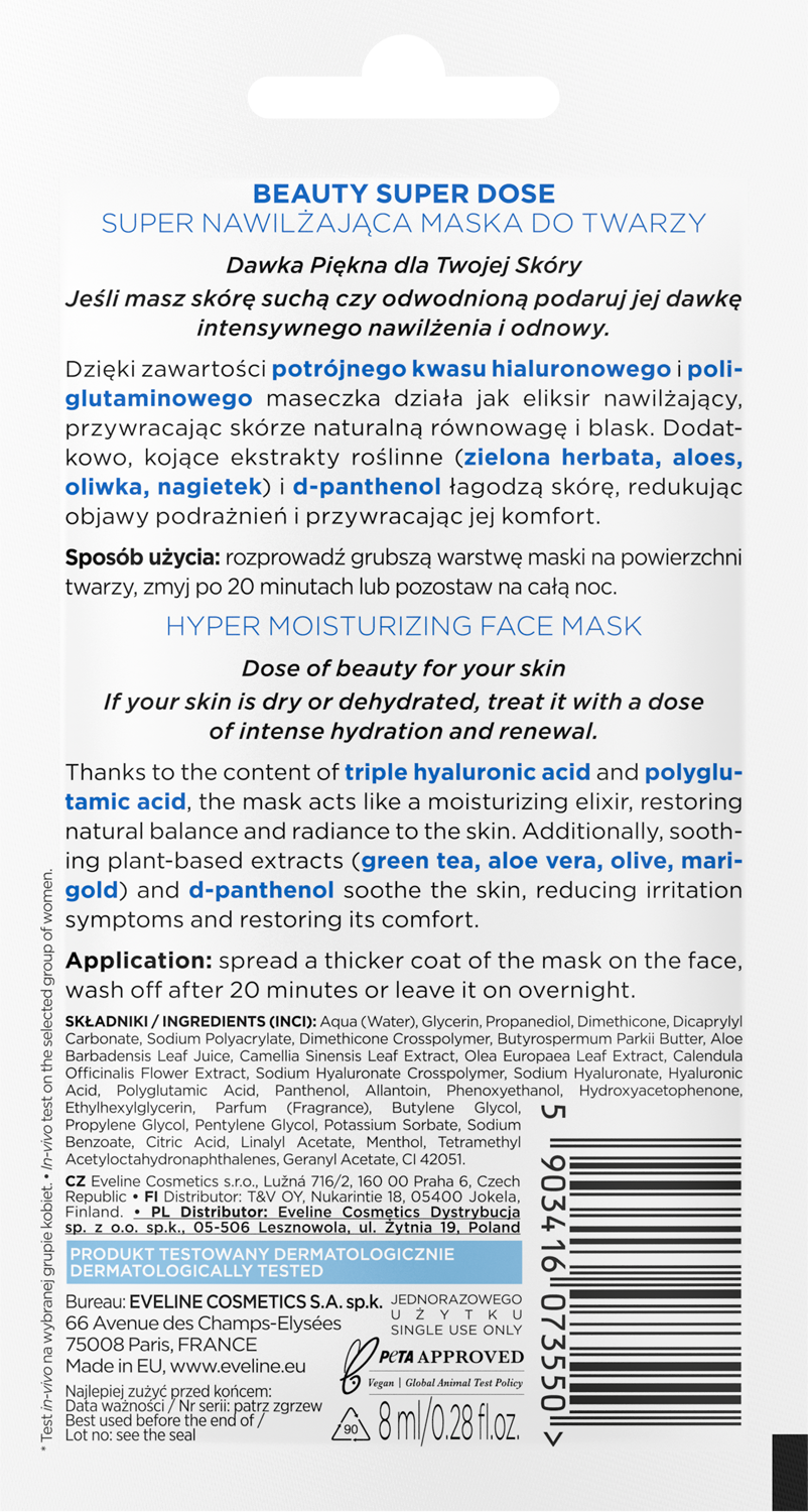 - Super nawilżająca maska do twarzy Eveline Beauty Super Dose Hyper Moisturizing stworzona z myślą o skórze suchej i odwodnionej.