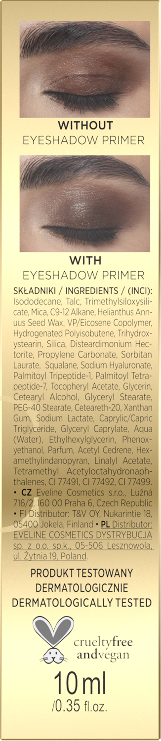 - Kosmetyk zapewni Ci długotrwały efekt makijażu i maksymalne wydobycie koloru cieni. Formuła została wzbogacona o peptydy, witaminę E i skwalan pielęgnuje powieki, dbając o ich kondycję przez cały dzień.