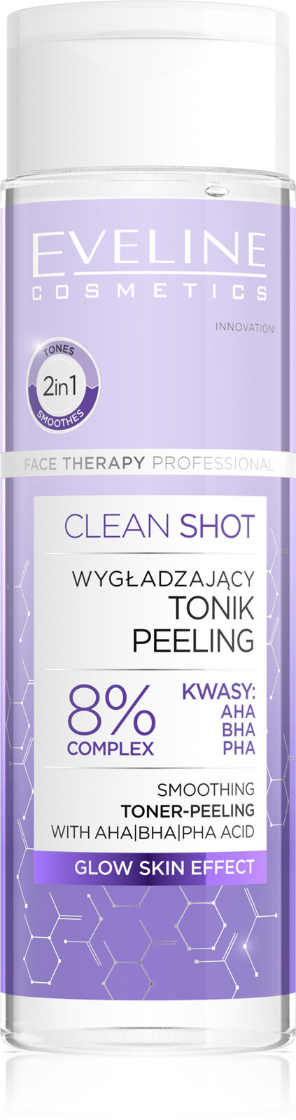 Eveline Clean Shot 8% Kompleks Kwasów AHA BHA PHA Wygładzający Tonik-Peeling dla każdego Rodzaju Skóry 200ml