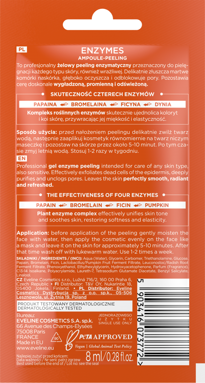 Ampoule-Peeling skutecznie złuszcza martwe komórki naskórka, głęboko oczyszcza i odblokowuje pory - bez ryzyka podrażnień. Dzięki kompleksowi roślinnych enzymów (papaina, bromelaina, ficyna i dynia) skutecznie ujednolica koloryt skóry, przywraca jej elastyczność i miękkość.