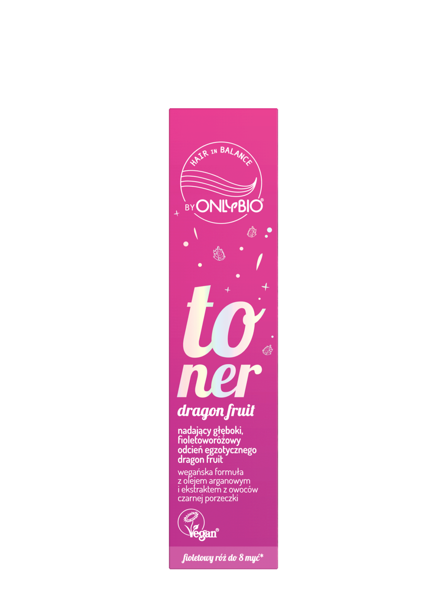 - Toner Dragon Fruit – fioletoworóżowy odcień do włosów blond i brązowych. Toner Dragon Fruit OnlyBio to idealne rozwiązanie dla osób pragnących fioletoworóżowego, egzotycznego odcienia z subtelnym połyskiem i zdrowym wyglądem włosów.