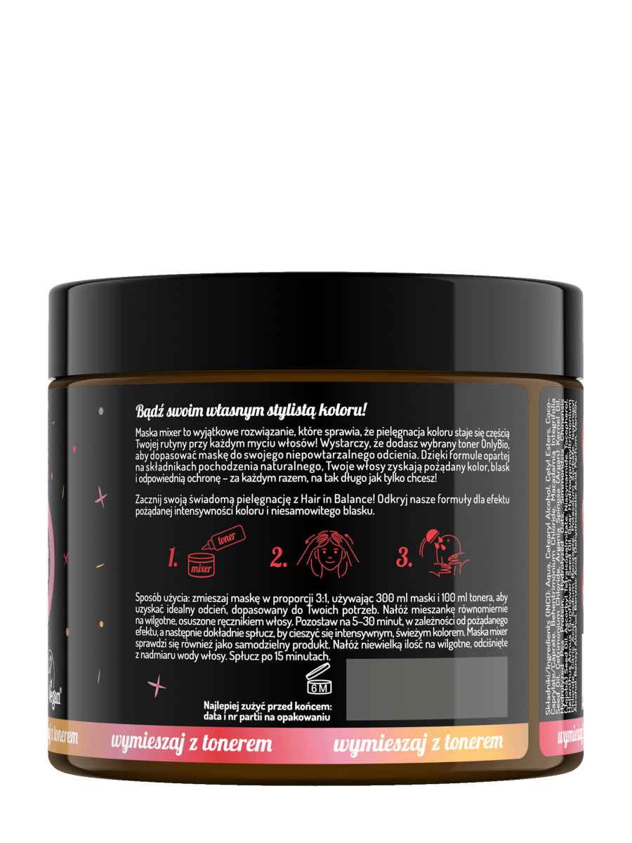 Maska Mixer Hair in Balance by OnlyBio to produkt, który pozwala na bezpieczną, łagodną koloryzację tonerem oraz intensywną pielęgnację przy każdym myciu. Dzięki niej możesz dopasować kolor do swojego stylu, odświeżać odcień i dodawać włosom blasku – bez wizyty u fryzjera.