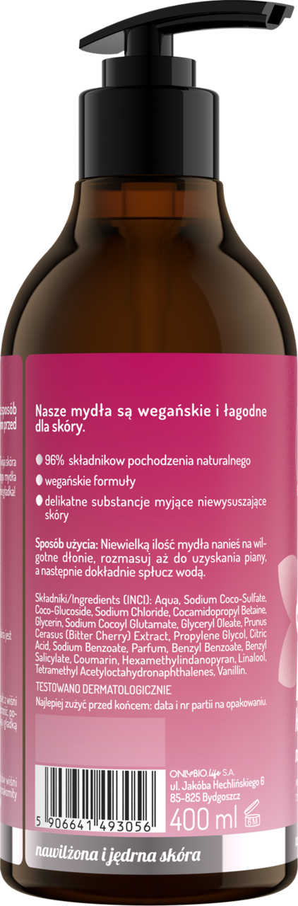 - Mydło do rąk w płynie Sakura o zapachu kwiatu wiśni zawiera wegańską formułę i naturalne substancje myjące. Ekstrakt z kwiatów wiśni poprawia nawilżenie i jędrność, pozostawiając skórę miękką i gładką w dotyku.